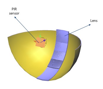 PIR(Passive InfraRed) lenses are usually not flat and are mostly round or square. In addition, separate materials should be used that can be passed on to the FIR(Far Infrared). And if there are multiple Fresnel lens patterns in it, it’s hard to model and simulate accurately with an optical design program.