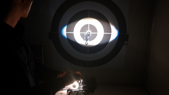 You can check the reduced irradiation area by using the iris and the lens barrel in this picture. It can be reduced to half angle 3 degrees at least, it may be more narrow through the aperture.
