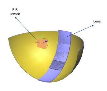 This is a domed PIR lens , and we developed it for request of local company . Sensing range 15 m, detection angle is 90 degrees above and below and 120 degrees right and left.